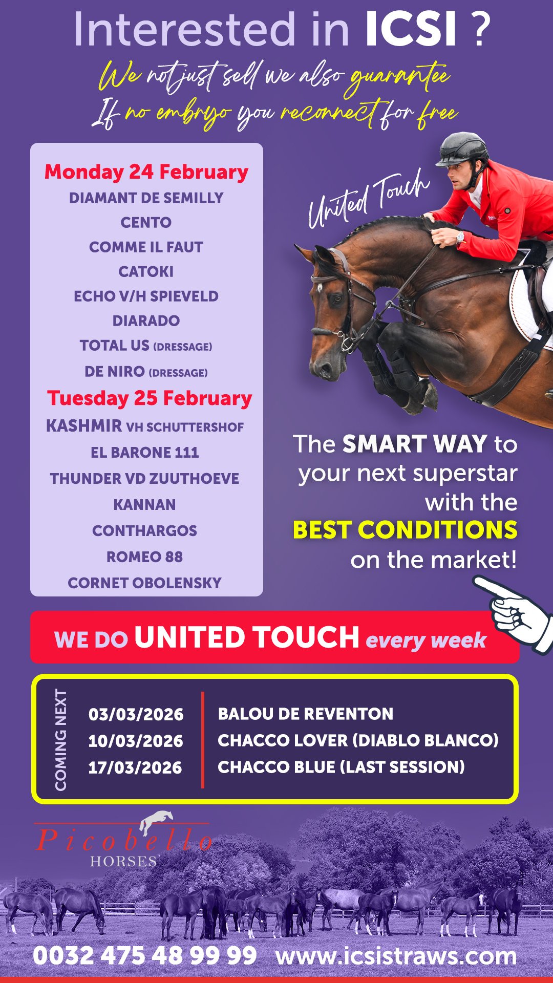 Picobello Horses biedt fokkers al meer dan vijftien jaar ongeëvenaarde toegang tot de absolute top van de internationale springpaardenfokkerij. En precies dat biedt Picobello Horses aan via hun ICSI-programma: de meest gevraagde namen ter wereld, altijd tegen de scherpste en eerlijkste voorwaarden van de markt.